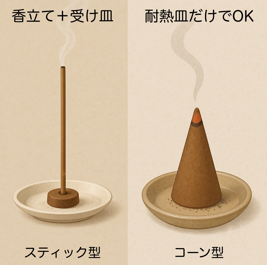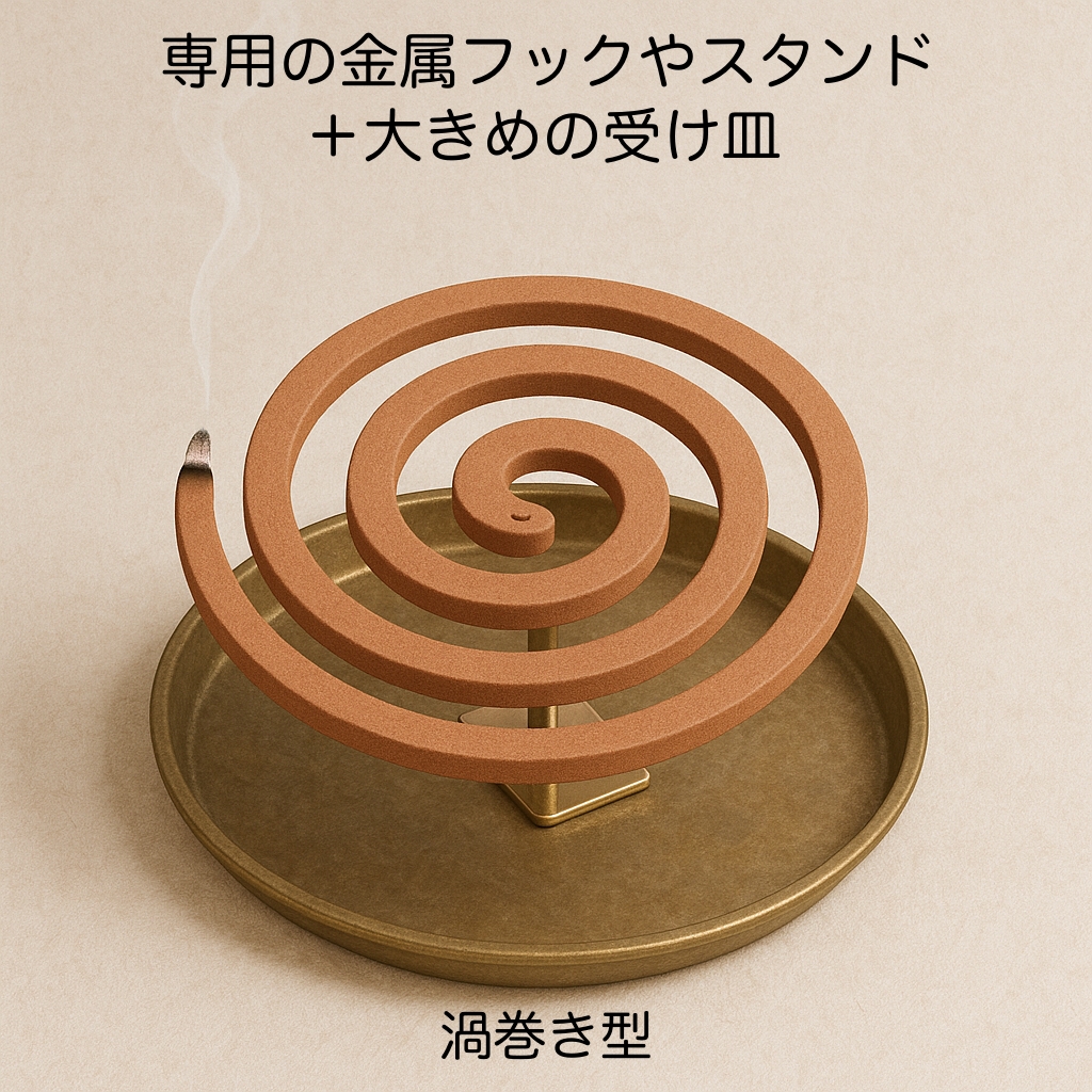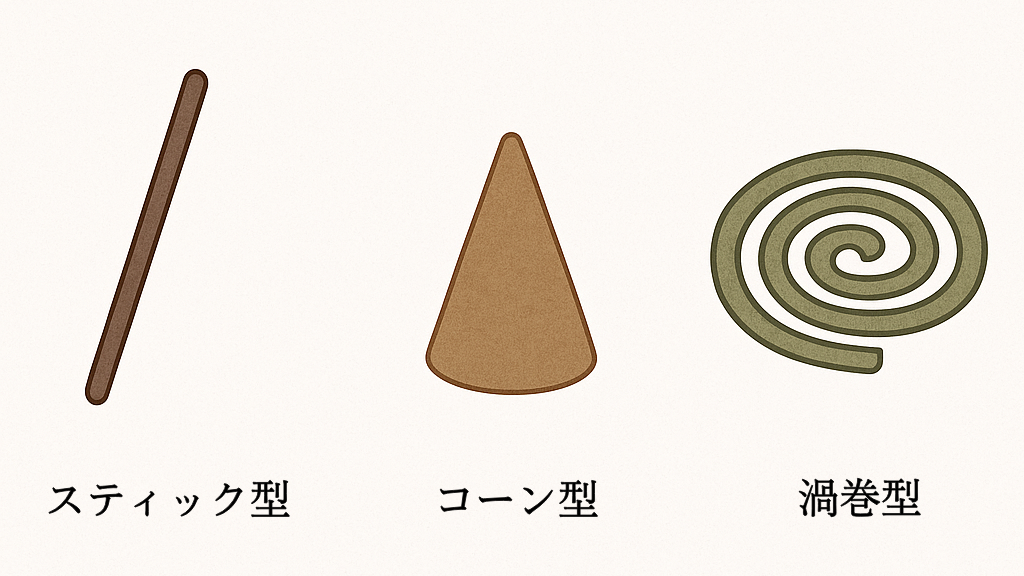 線香とは「直接、火をつけて焚くタイプのお香」を指し、形状によってスティック型、コーン型、渦巻き型などがあります。