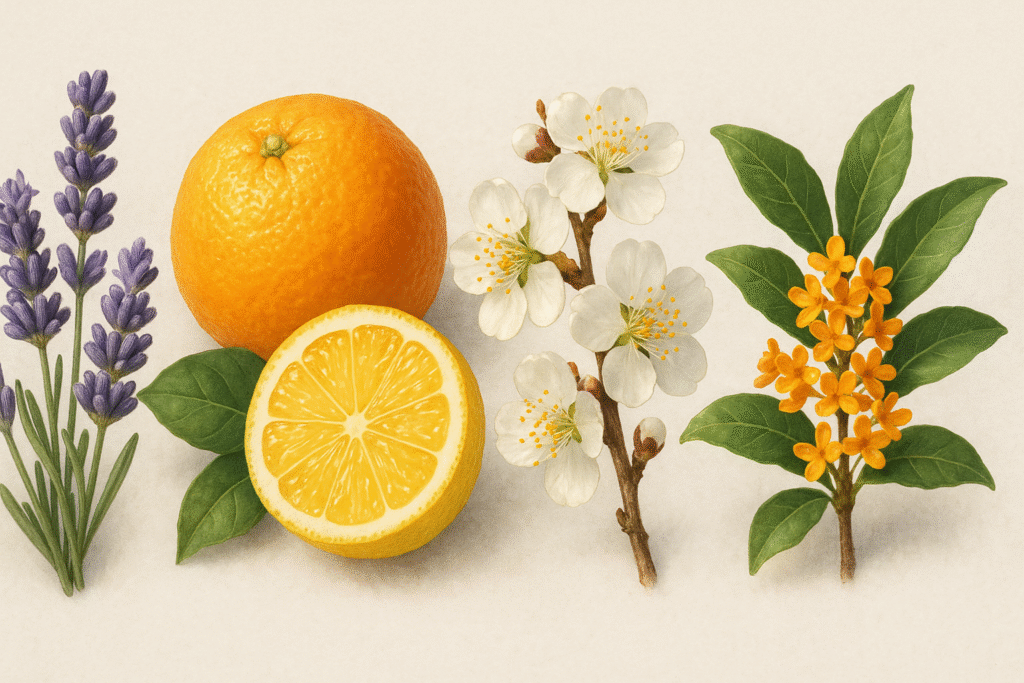 - 代表:ラベンダー、ローズ、梅、金木犀、柑橘類など